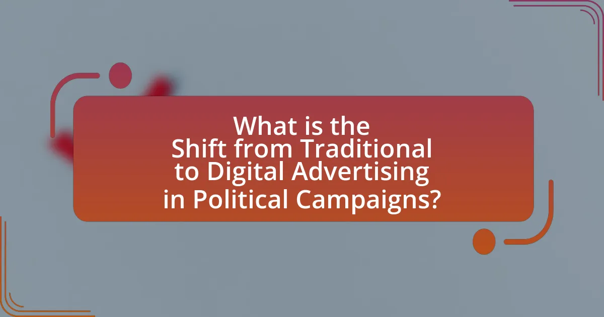 The shift from traditional to digital advertising in political campaigns refers to the transition from methods such as television, radio, and print media to online platforms like social media, websites, and email marketing. This change has been driven by the increasing internet penetration and the growing importance of data analytics, allowing campaigns to target specific demographics more effectively. For instance, according to a 2020 report by the Pew Research Center, 72% of Americans use social media, making it a crucial channel for reaching voters. Additionally, digital advertising allows for real-time feedback and adjustments, enhancing campaign strategies based on immediate voter responses.